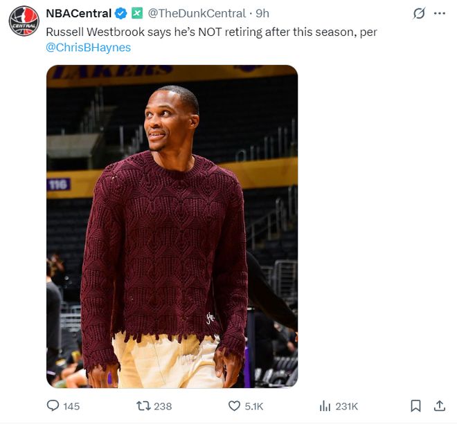 根据克里斯-海恩斯的报道,威少无意在新赛季结束后退役,这或许已经是少爷最后的倔强了。