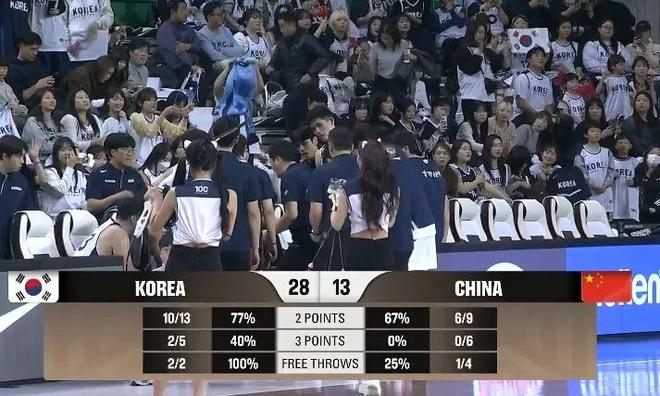 陷入得分荒的中国男篮做出调整,胡明轩、张镇麟依次替补上场,但他们同样手感不佳。直到廖三宁、胡金秋登场后,中国男篮才勉强让分差保持在15分。 首节比赛,韩国男篮2分命中率77%,3分命中率40%,28-13领先中国男篮。